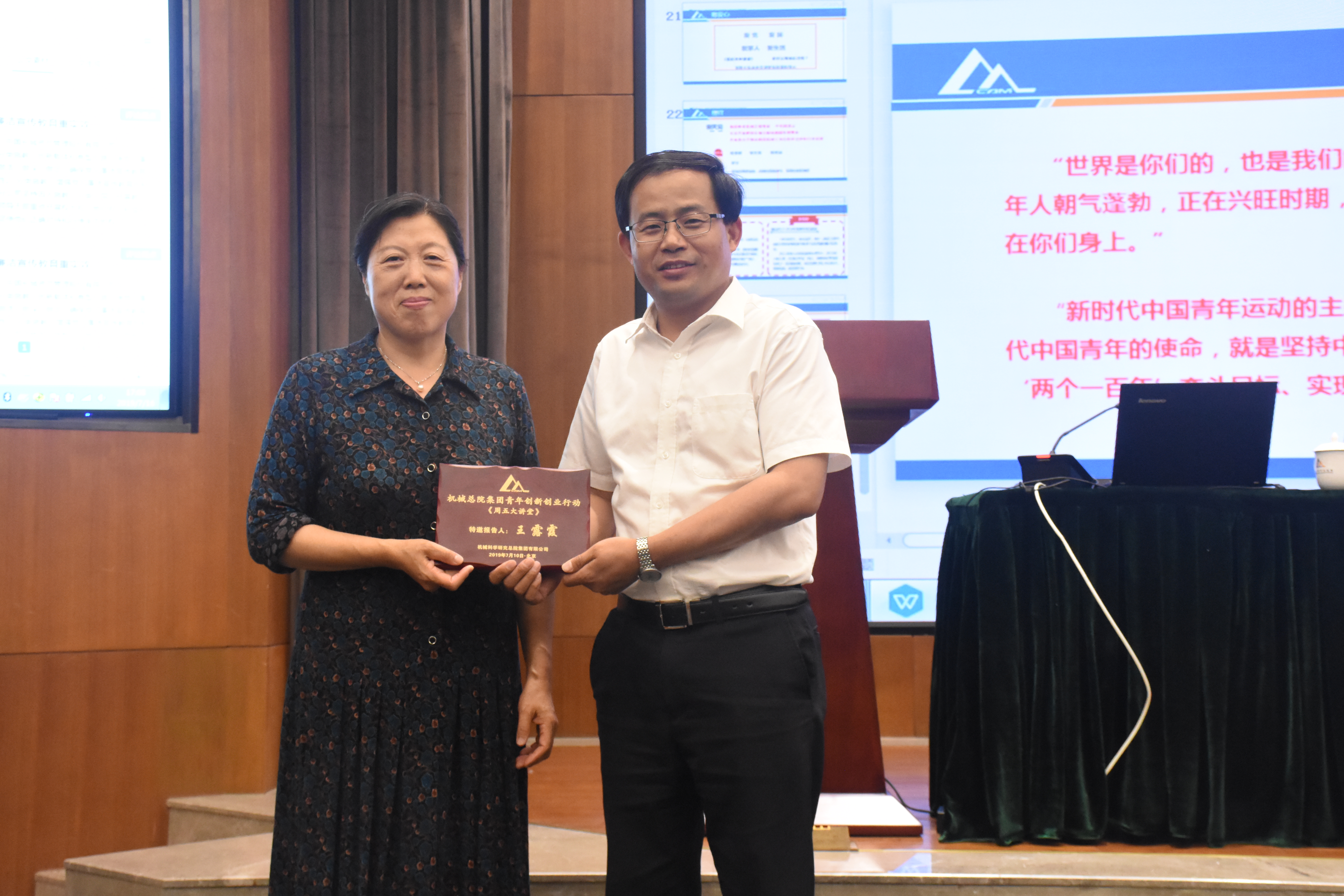 7月16日下午,人資部和機械總院集團團委共同舉辦了2019年第六期周五大講堂,本次講堂邀請到原機械總院黨委副書記、紀(jì)委書記、副院長王露霞同志,做題為“建功立業(yè)新時代”的主題講座,集團單忠德副總經(jīng)理主持并為王露霞老師頒發(fā)紀(jì)念獎牌,總院集團及在京各二級單位七十余名研究生、青年員工聆聽了本次報告。